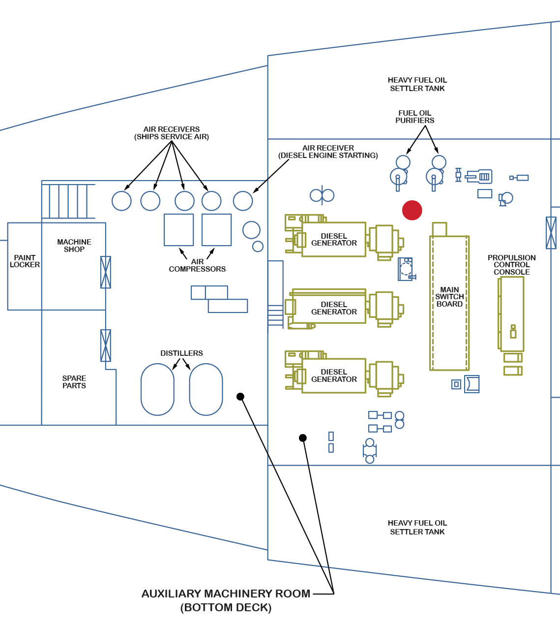 Port side of the center section of the auxiliary machinery space. Initial view (looking aft) is the port generator on the left and one of two Alfa-Laval oil purifiers on the right.