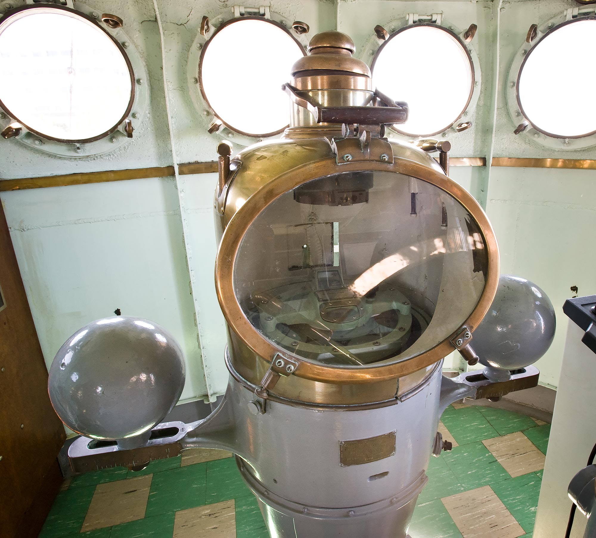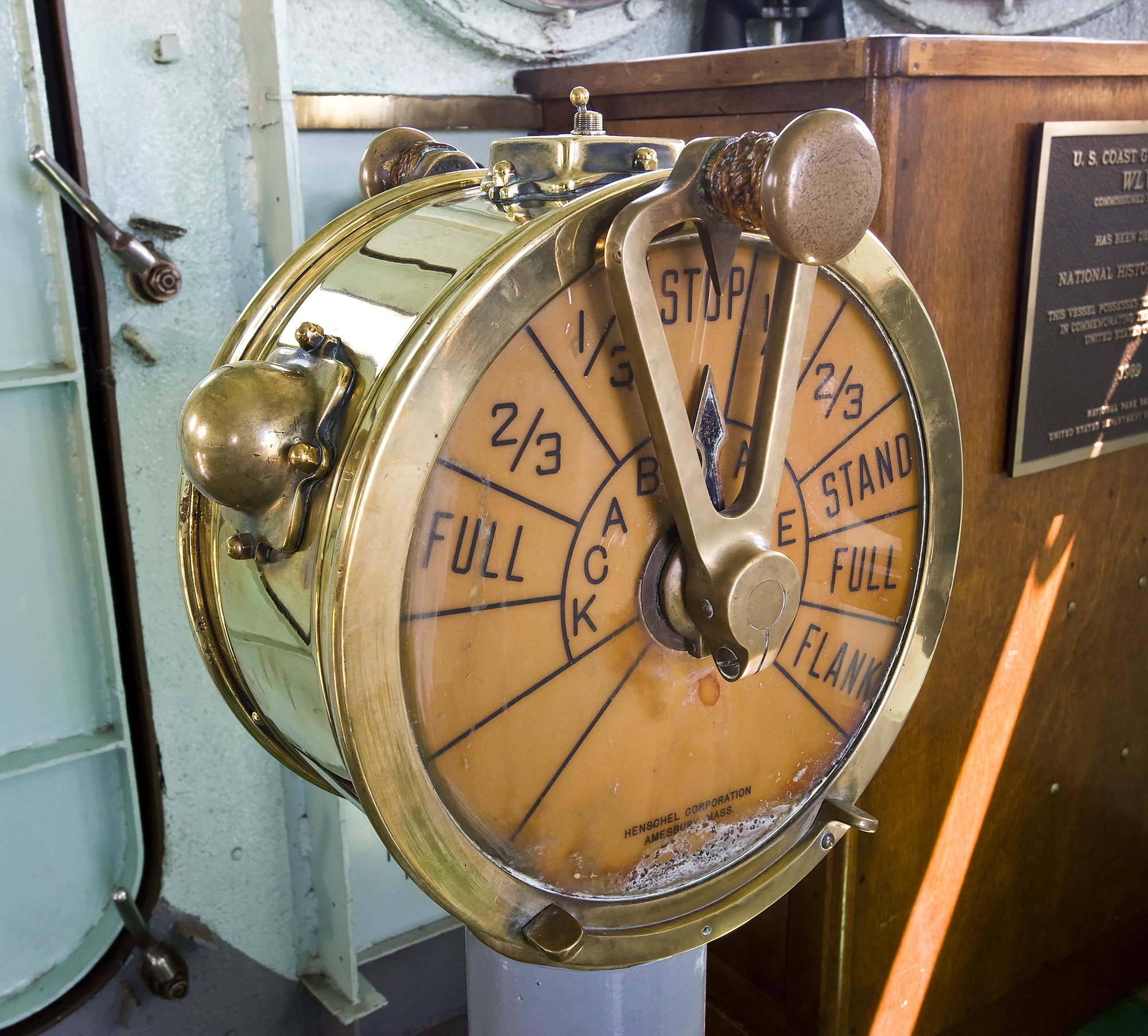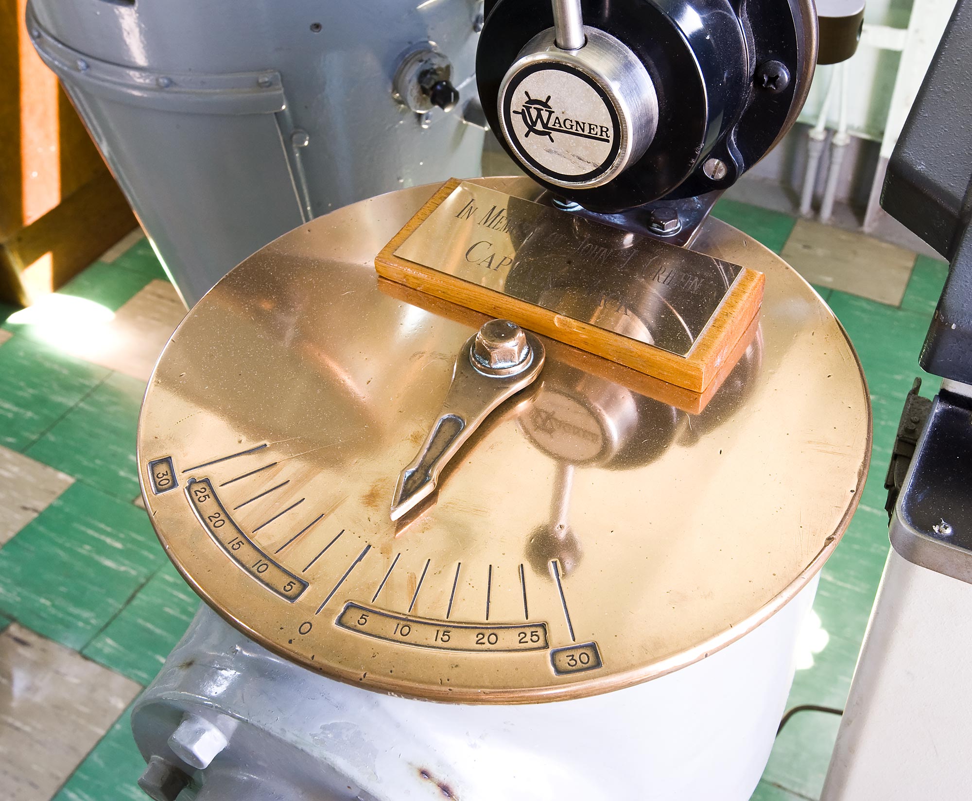 The device on the pedestal to the left of the compass is the Engine Order Telegraph; it does not actually operate the ship’s engine but merely communicates orders. When the handle is moved, bells ring in the Aft Engine room and the indicator on that telegraph dial moves to the same order. The engineer moves his handle to change this small arrow to indicate the order is understood.