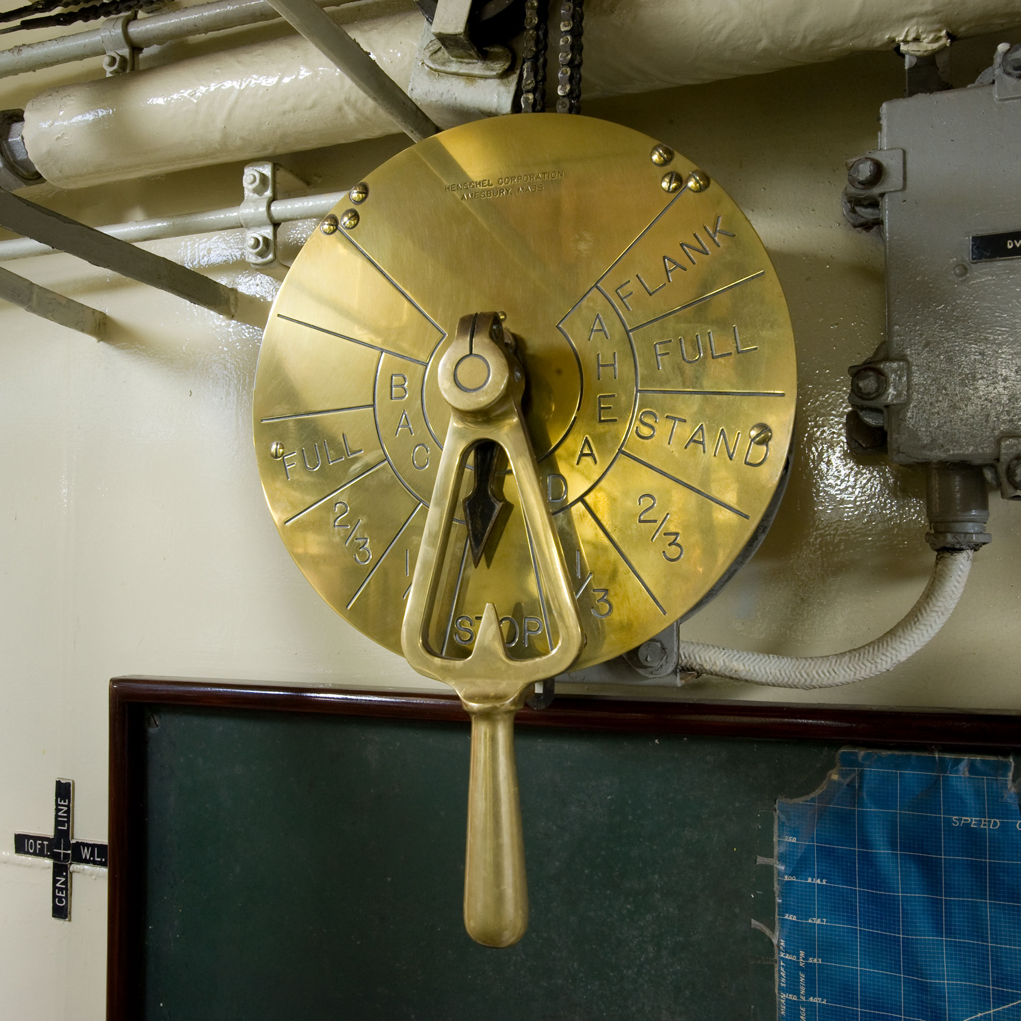 The B-2 or aft engine room contains a back-up duplicate of all critical machinery (generator, air compressor, fire pump, switchboard) plus the main propulsion engine. You can count the eight cylinders of the 550 horsepower supercharged Atlas Imperial diesel engine. It is a direct reversible engine; meaning there is no clutch or reverse gear. To reverse, the engine must be stopped, the cam reversed, and the engine restarted, sending the crankshaft in the opposite direction. Compressed air starts and reverses the engine. Ships cruising speed was 10 knots. A reduction gear under the step-up spins the propeller shaft at about one third the speed of the engine. Note the brass disc with the pointer behind the ladder that is the engineer’s end of the engine room telegraph you saw in the wheelhouse.