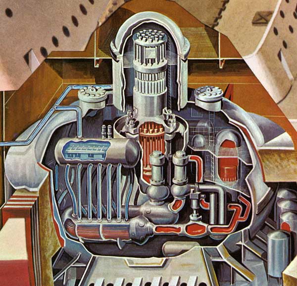 Inside Reactor Containment Vessel Forward of Reactor can be seen the large reactor pressure vessel (painted in orange). Inside the reactor are the fuel and control rods that are used to generate heat and control the nuclear chain reaction. Around the rods circulates the high pressure, high temperature (around 500 degree) water of the primary cooling loop.