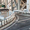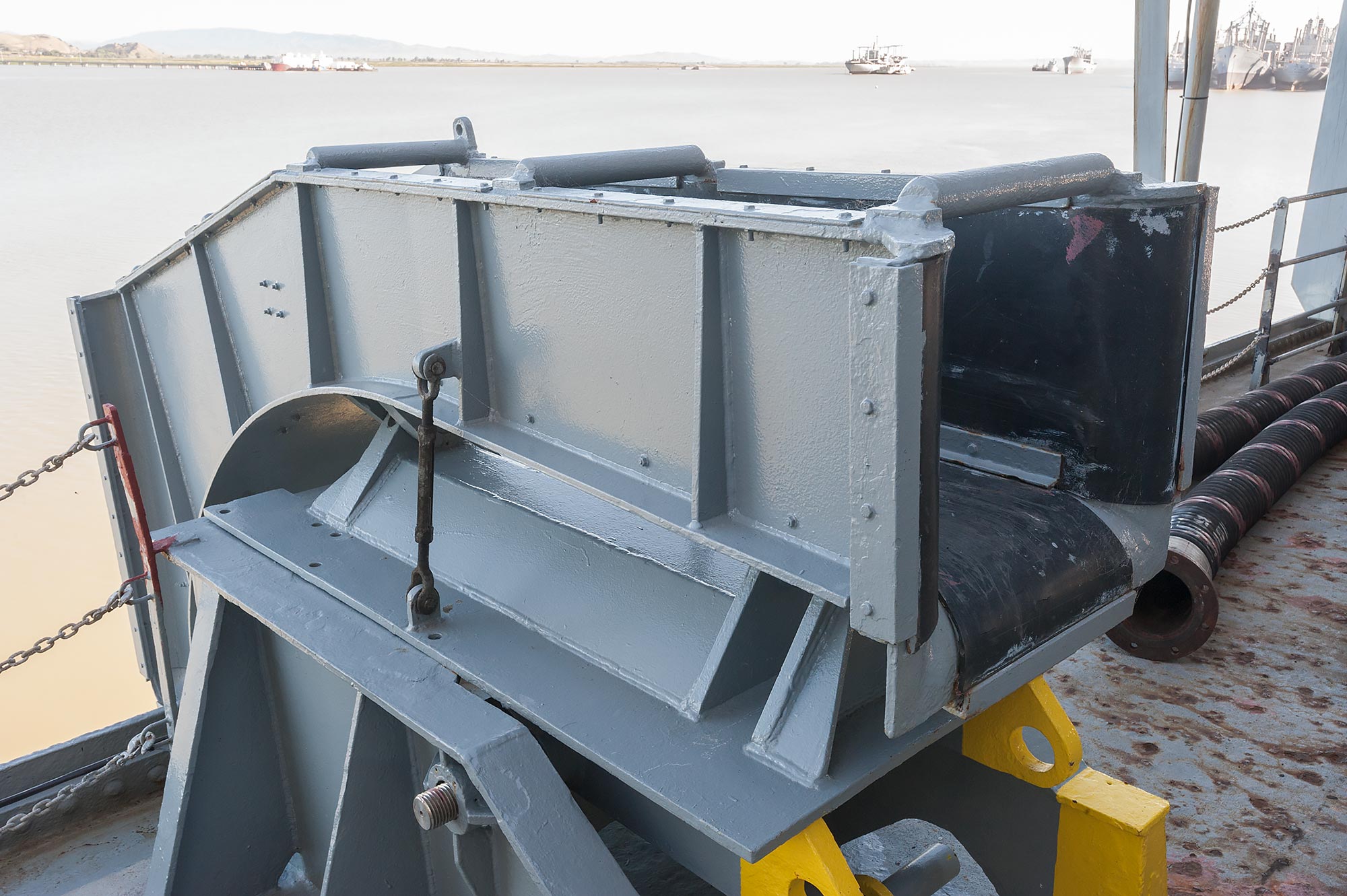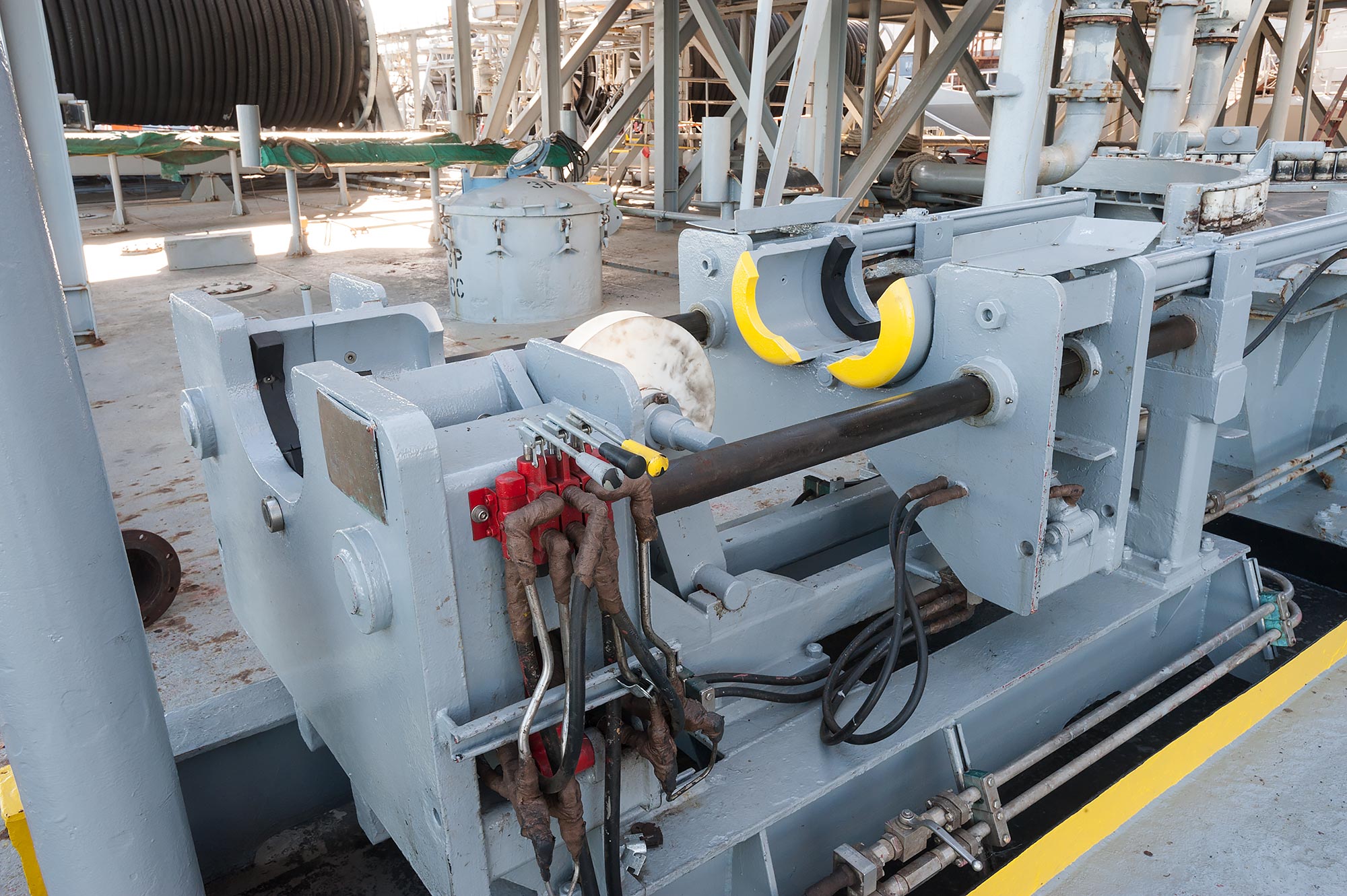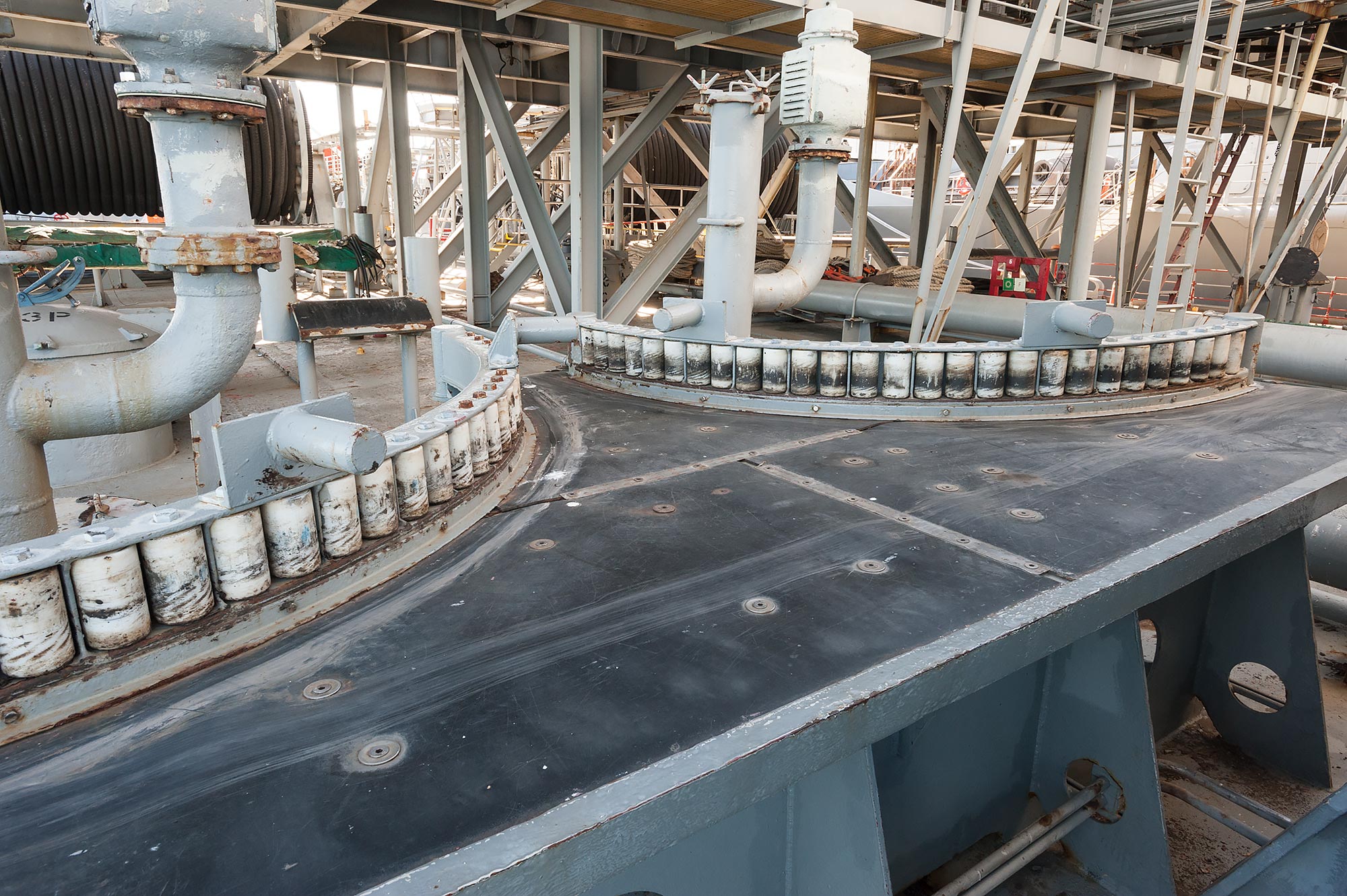 Weather Deck – Amidships. Initial view: Looking forward at the Conduit Clamping table (contained in the yellow fish plate). Above the clamping table can be seen cradles for the OUB Boats. Panning right: Pedestal for 59 ton crane. One corner of the SLAM Barge can be seen when looking directly aft.