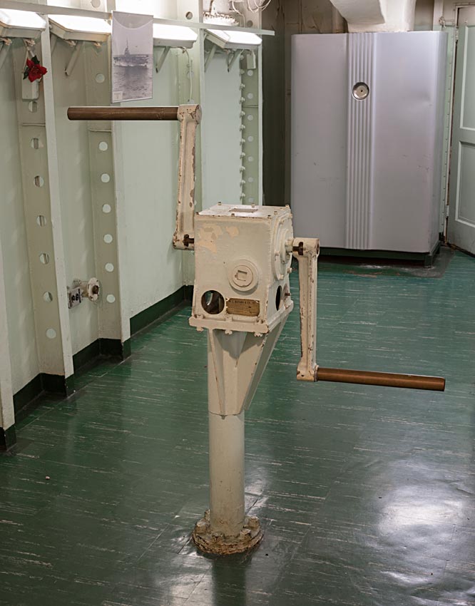 The Chief Petty Officer (CPO) mess is where the Hornet's CPO's (senior enlisted men) ate their meals. Adjacent to this space is the CPO lounge where the rudder centering device is located. This device was used to center the rudder and lock it into position if the steering mechanism was out of order.