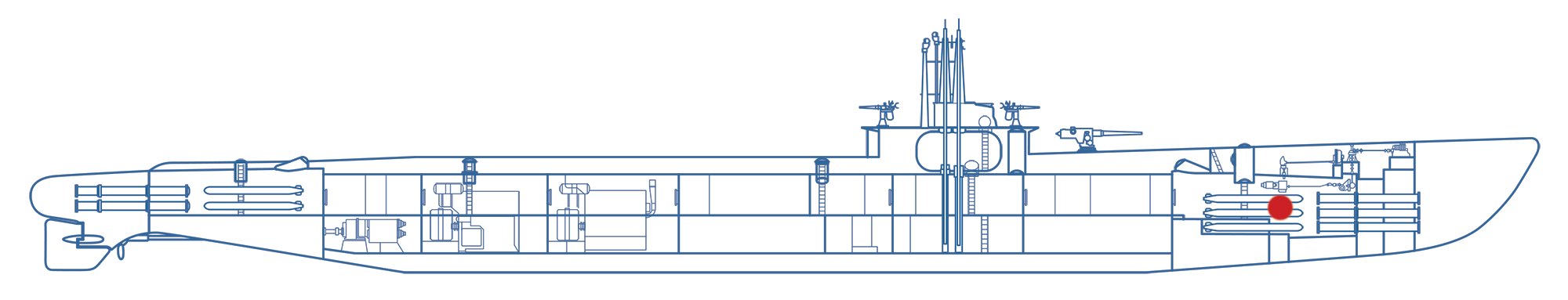 This compartment was the sleeping quarters for about 14 crewmen, who shared the space with 16 Mark 14 torpedoes - 6 in the tubes and 10 reloads. The torpedo tubes in the bow of the boat were always loaded and ready to fire.