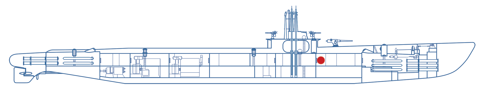 The forward battery was also known as "officers' country". The officers' worked, ate and slept in this area. The most senior enlisted men, chief petty officers, also berthed in this compartment but they ate in the Crew's Mess. Below this compartment is another battery compartment like the one located under the crew's living space. On your right as you enter the compartment from the control room is the yeoman's office where reports were prepared and records kept.