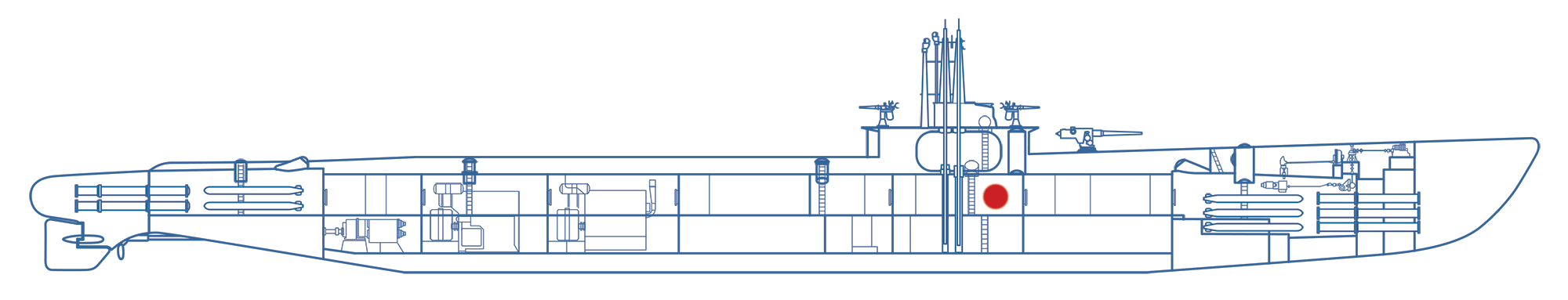 The diving control station is located at the center of the port side, just forward of the Trim Manifold. It provides controls for bow and stern plane tilting, and bow plane rigging. They were operated by hydraulics or by hand during silent running.