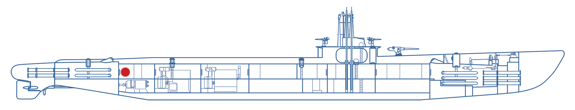 The maneuvering room is where all of Pampanito's changes in speed were made in response to orders from the conning tower, bridge, or control room. Pampanito's engines do not drive the propellers directly; instead, they turn electric generators attached to each engine. Power from these generators was switched to charge the main storage batteries, or to supply the electric propulsion motors. Switching was done with the levers of the propulsion control stand and the cubicle behind it. Because diesel engines require large amounts of air to operate, they are used only while on the surface. U.S. submarines were not equipped with snorkels during World War II. When submerged, power was drawn from the main batteries which supply the same electric motors that the generators supply when the ship is surfaced.